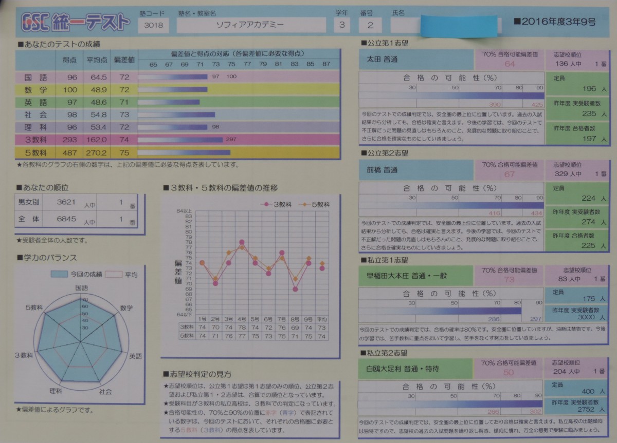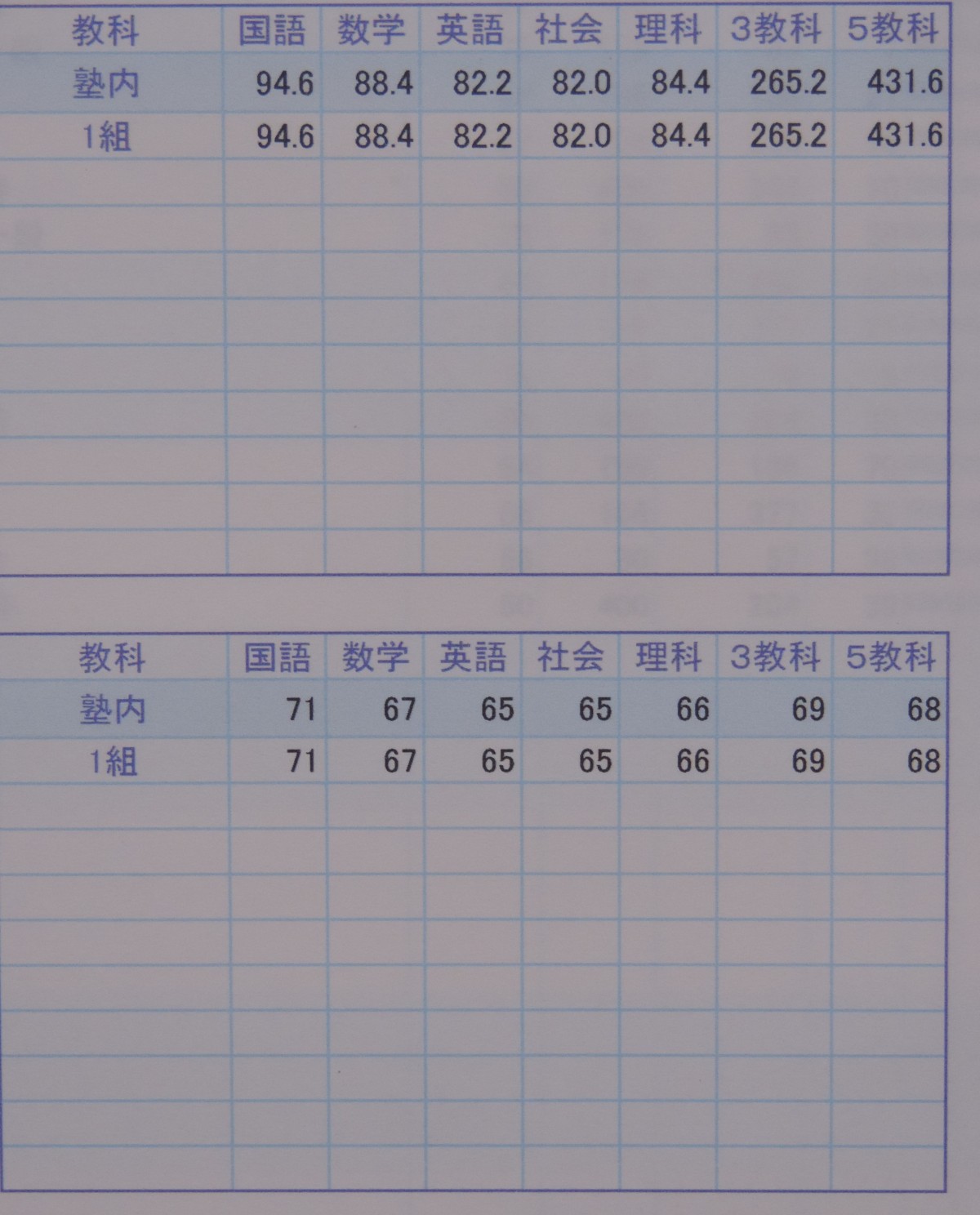 国語の重要性をご理解して下さる保護者様のご子女は、学年1位もしくは学年最上位になります。さらに群馬県統一テストや全国模試でも県内1位、全国1位もしくはそれぞれの模試で最上位の成績を修めます(5科目の総合偏差値が70~80になります)。