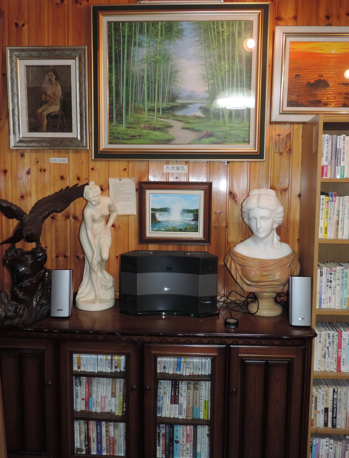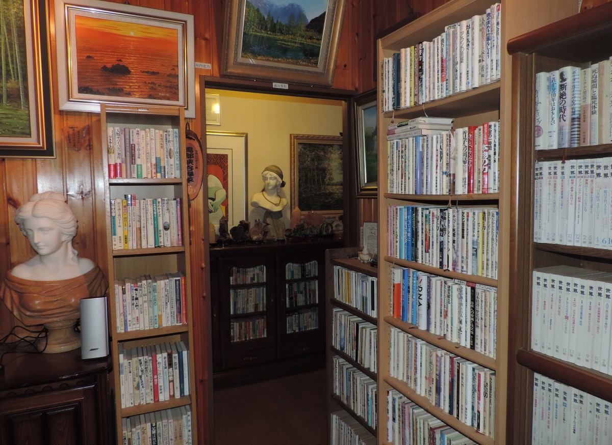 塾長室兼書斎です。ログハウス風に設計しました。この部屋で原稿執筆や音楽鑑賞をしています。蔵書数約2万冊の中、5000冊位収蔵してあります。クラシックCDは、ほぼ全曲揃っていると思います。他にロック、ジャズ、ヒーリング曲を気分によって聞き分けています。最近では、ルドヴィコ・エイナウディの「I Giorni Dispari」のピアノソロにはまっています。別バージョンのCDを買って、聞き比べをしています。皆さんにもお勧めします。