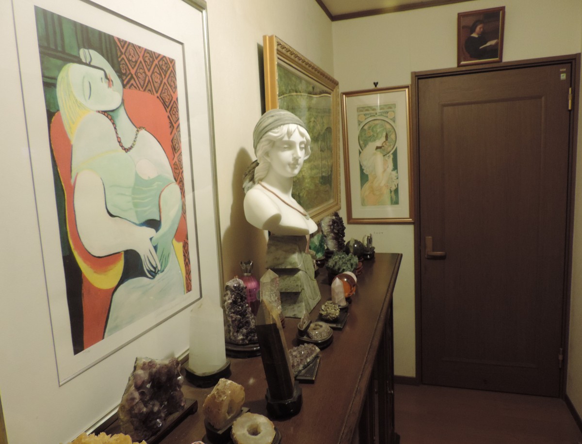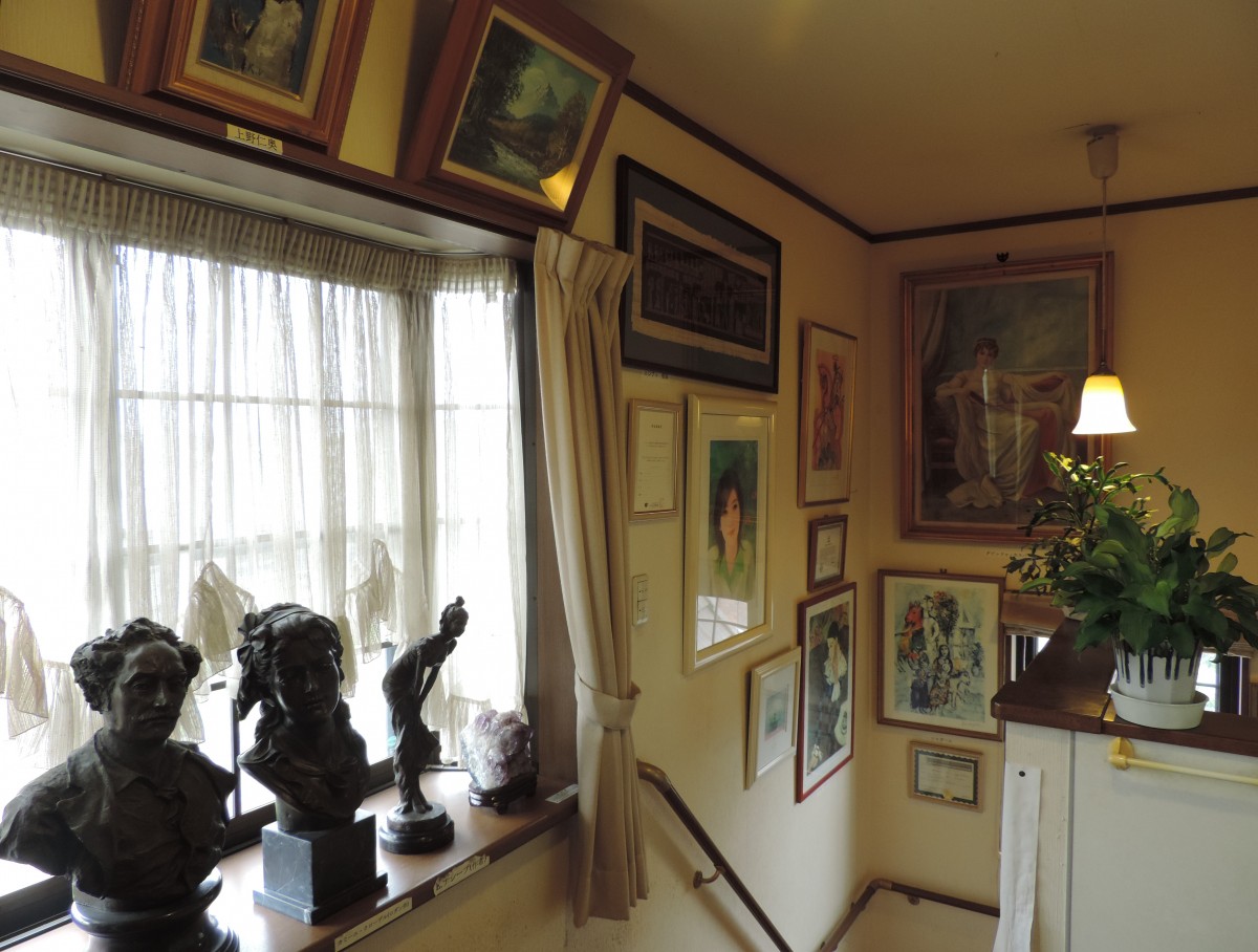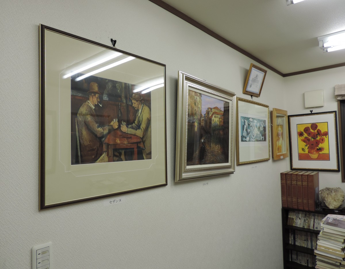 当塾内には、事務所と塾長室(ログハウス風)と三つの教室とホールに100点以上の絵画と大理石・ブロンズ彫像が展示されています。芸術作品を鑑賞することによる効能として、副交感神経を高め、リラックスさせる働きがあると医学的に実証されています。学習中には交感神経が優勢になり、緊張状態に置かれますが、休憩時間に四方に飾られてある絵画に触れることで副交感神経が刺激されて弛緩状態に戻されます。この緊張と弛緩のバランスが学習に非常に良いと言われています。左脳と右脳の絶妙なコラボレーションが作用している訳です。私たちの身近な医療機関や福祉施設にも多数の絵画や彫像が展示されていることからも説明がつくと思います。当塾にも希少価値のある19世紀の油彩画(証明書付き)が3点展示されています。