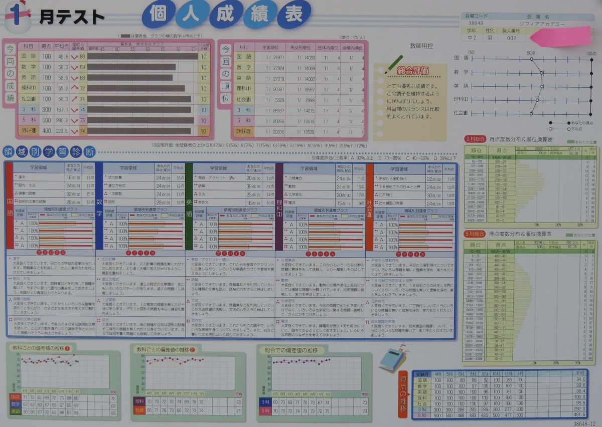 A君の中2年時の全国模試の成績表です。2月分を含めて計9回受験しましたが,そのうち6回全国全体1位を取得しました。国語の偏差値が80です。500点満点でパーフェクトの500点!しかも500点満点を4回取っています。私の長い予備校・塾講師経験で初めてのことです。当方の指示通りの学習をきちんとしてくれた塾生でした。画面をタップすると拡大します。