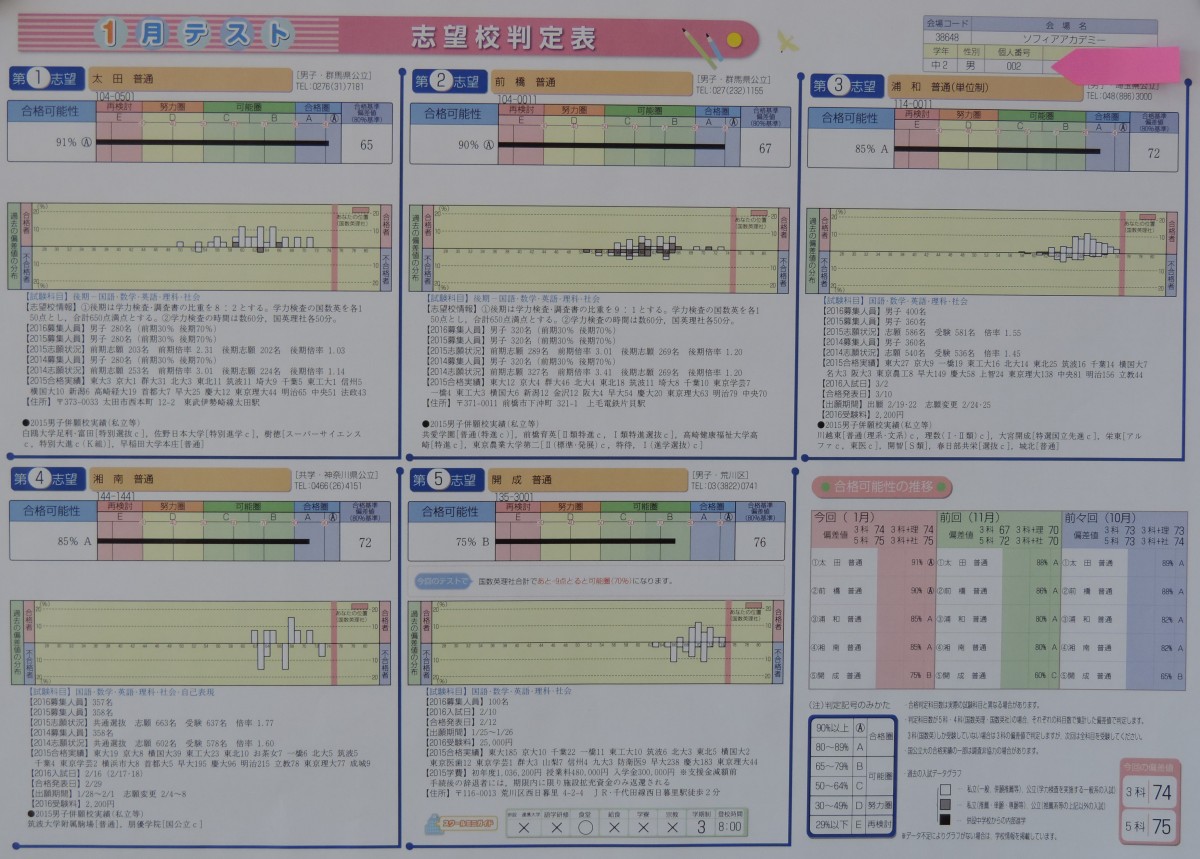 A君の成績が全国の難関高校でも通用するかを知るために超難関高校も含めた合否判定表を掲載しておきます。埼玉県の県立浦和高校でもトップ合格、神奈川県の県立湘南高校でも同様です。そして、最難関の東京の私立開成高校でも最上位に位置しています。
